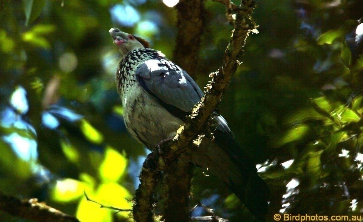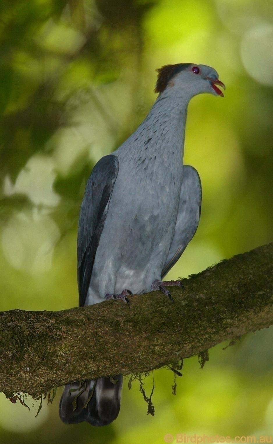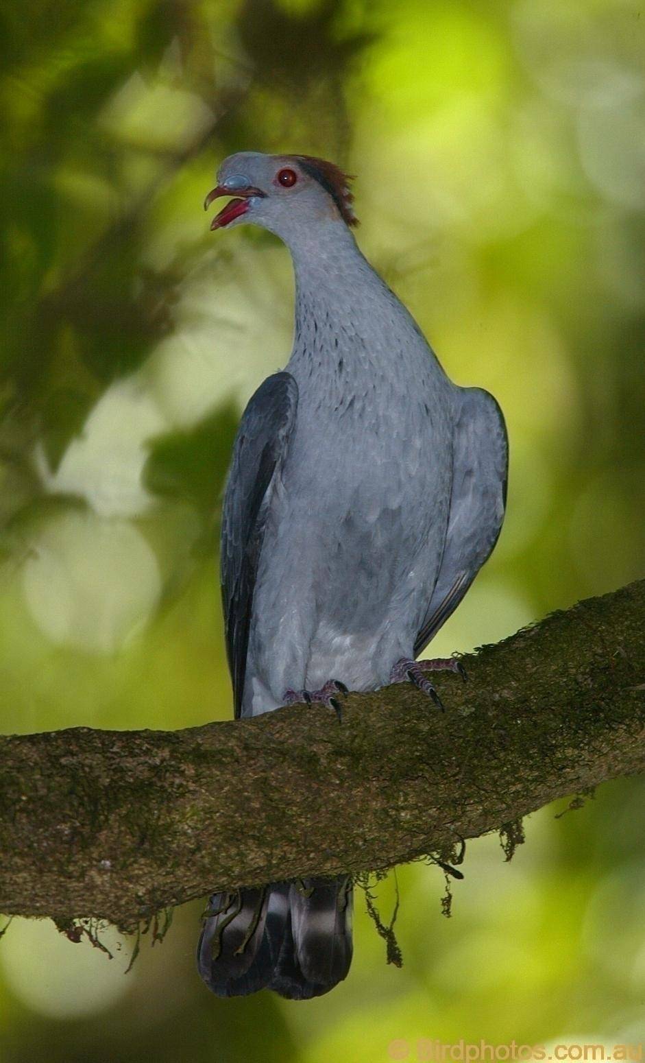 Size: 40-60cm Habitat: Found down the East coast of Australia, this Pigeon inhabits rainforest and the surrounding woodlands. Diet consists of native fruits. Notes: Grey bird with grey crest and orange nape, red bill and eyes, black tail with grey band. Breeds Winter-Spring.