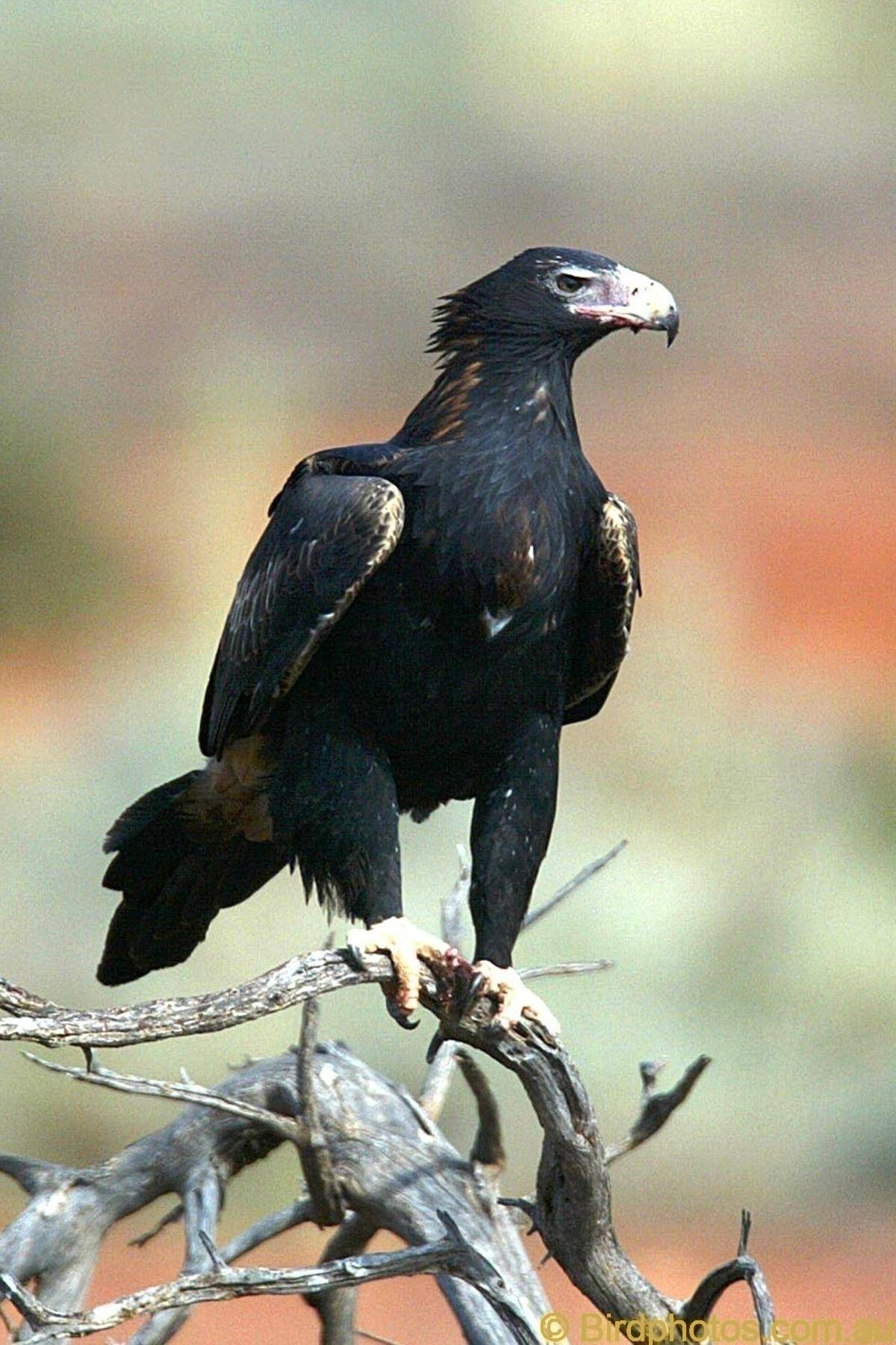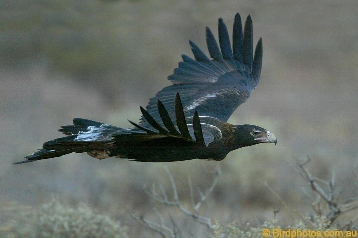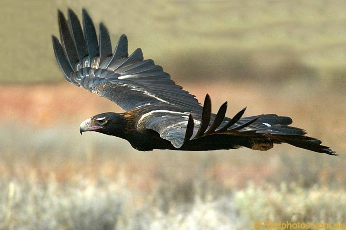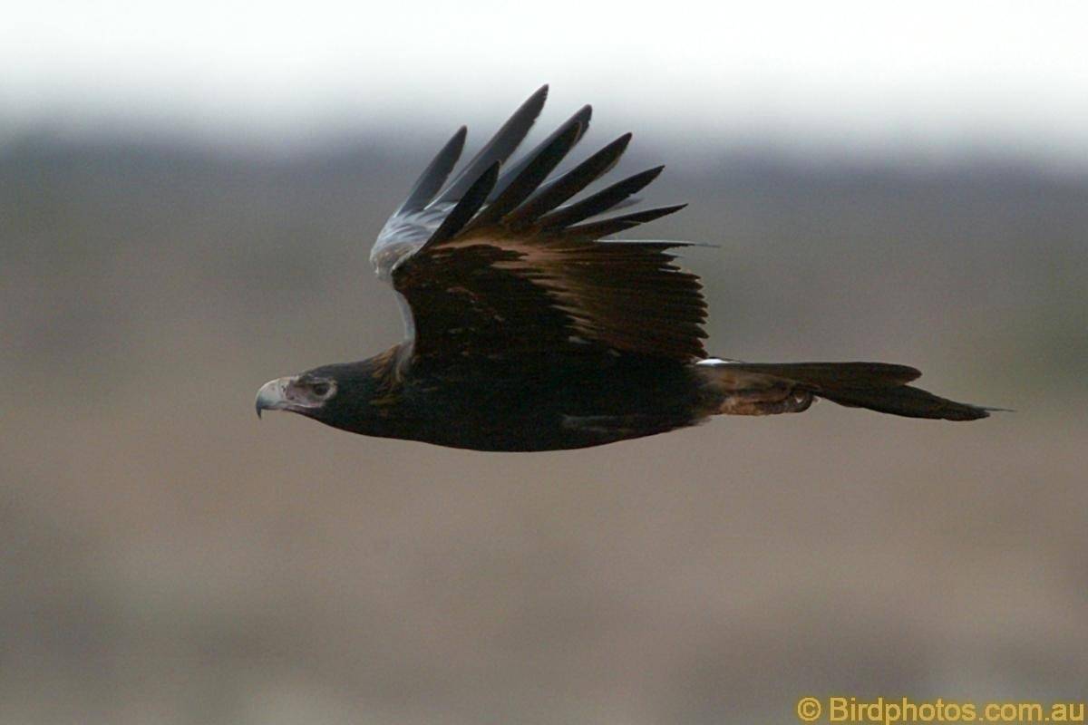 Size: 87-104cm Habitat: Found across Australia excluding closed forests, This is Australia's largest raptor with a huge wing span of almost 2.5 meters the Wedge tail feeds on a diet of rabbits, marsupials, reptiles and birds, often seen on the side of roads feeding on carrion. Adult birds become darker with age. Notes: Head and body black to brown depending on age, Distinctive wedge shaped tail in flight. Fully feathered legs. Can soar to a height of 2000 meters. Breeds Winter - Spring.