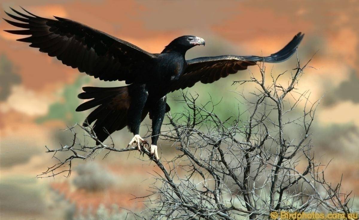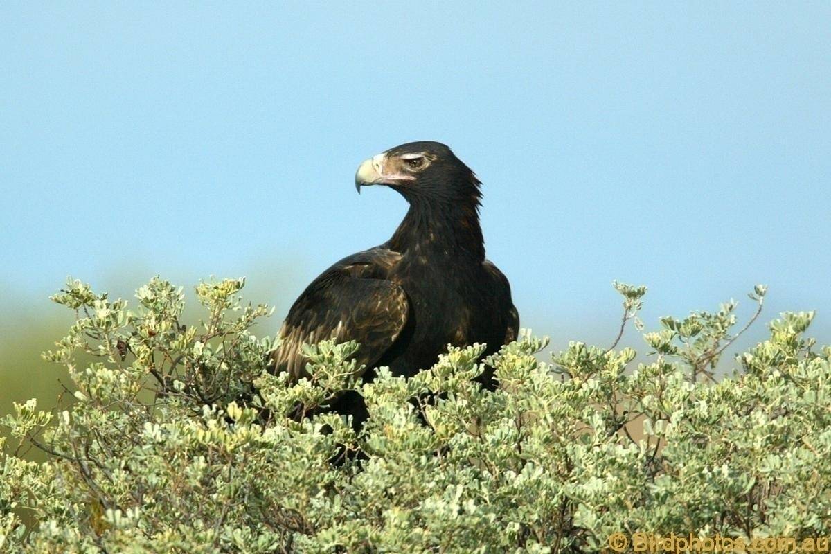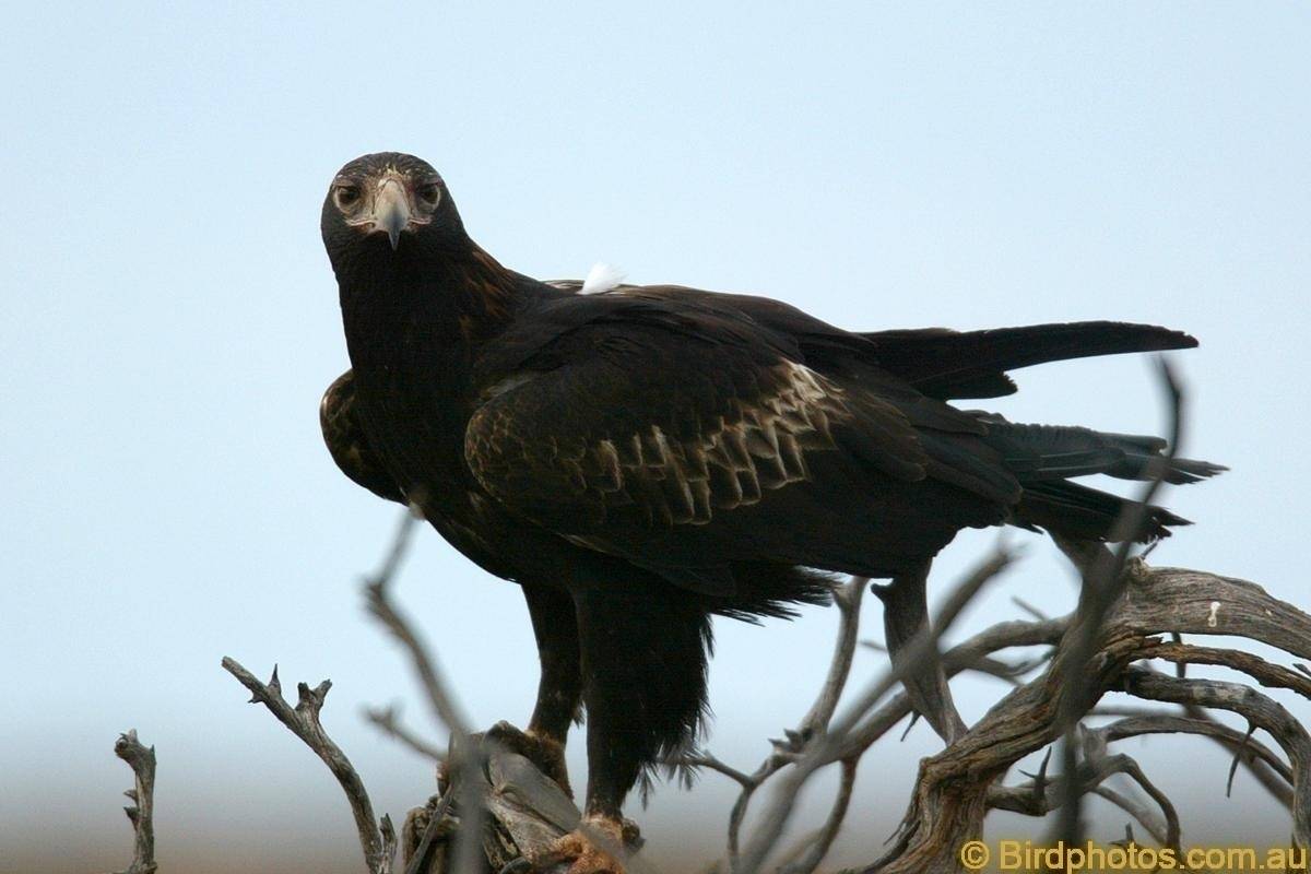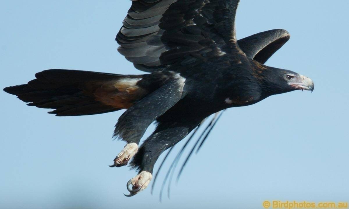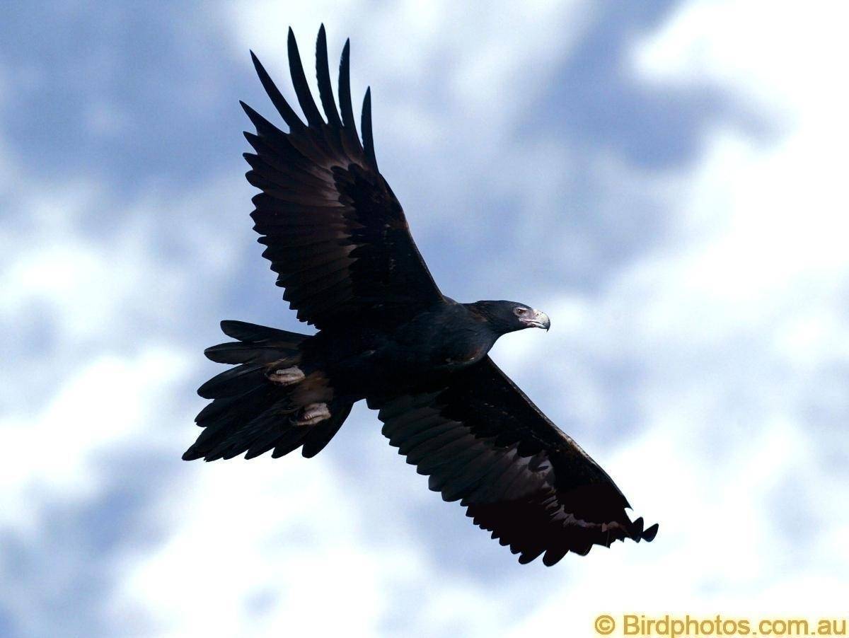 Size: 87-104cm Habitat: Found across Australia excluding closed forests, This is Australia's largest raptor with a huge wing span of almost 2.5 meters the Wedge tail feeds on a diet of rabbits, marsupials, reptiles and birds, often seen on the side of roads feeding on carrion. Adult birds become darker with age. Notes: Head and body black to brown depending on age, Distinctive wedge shaped tail in flight. Fully feathered legs. Can soar to a height of 2000 meters. Breeds Winter - Spring.