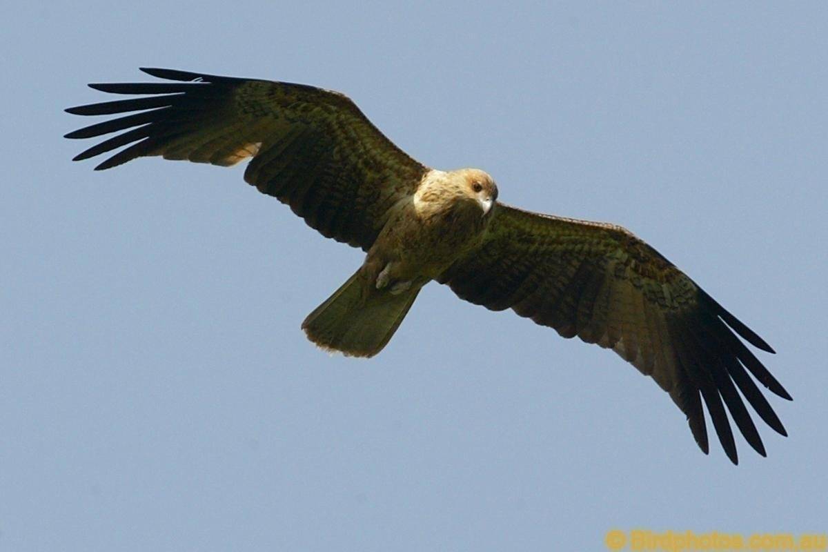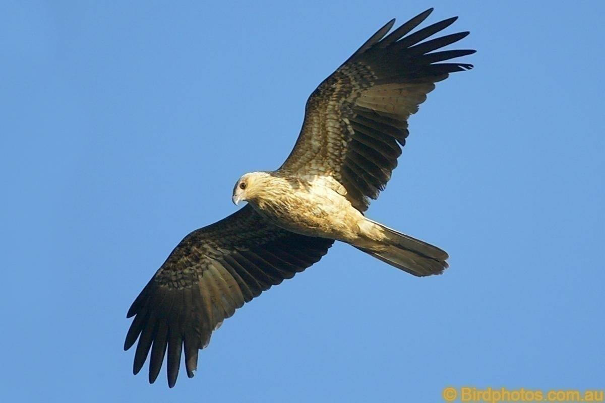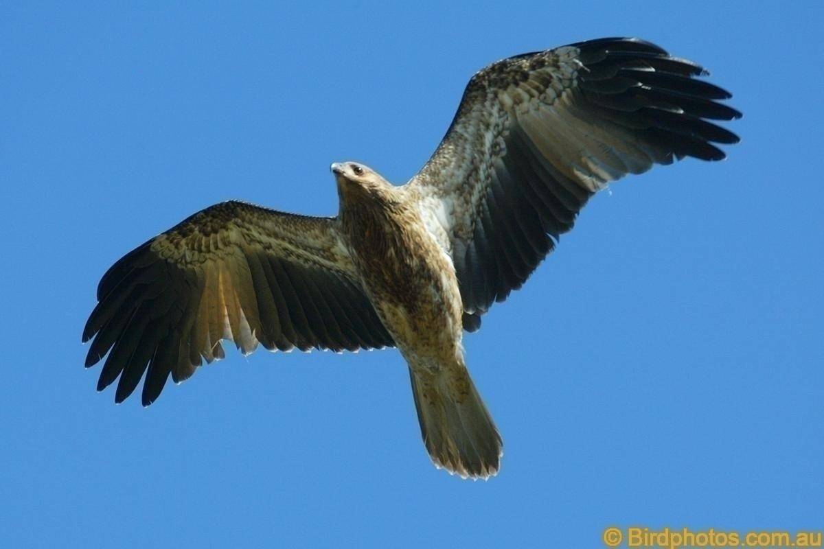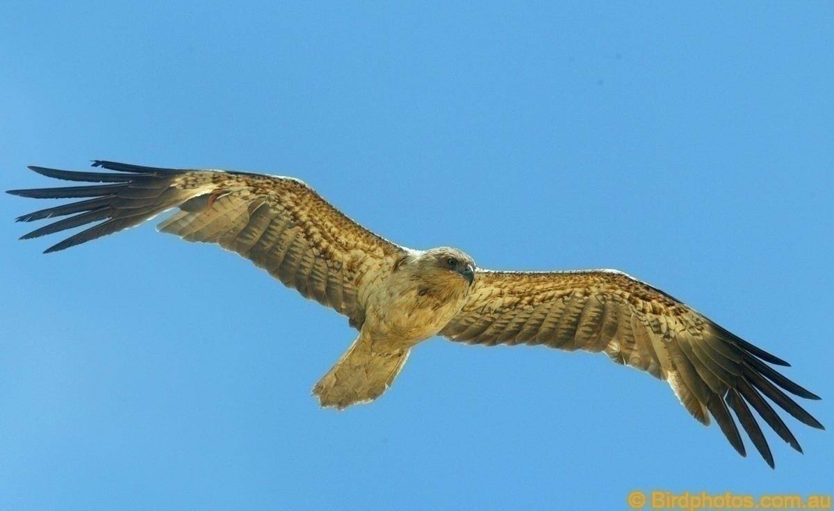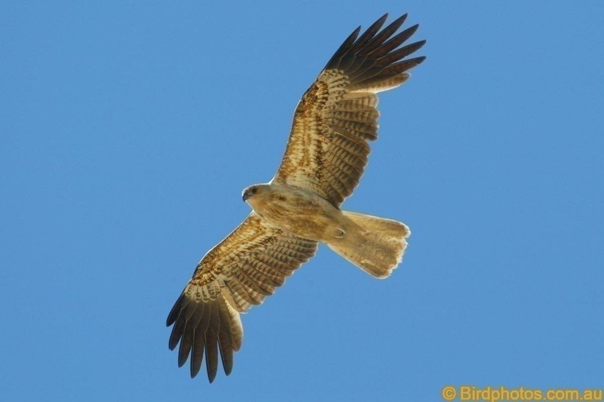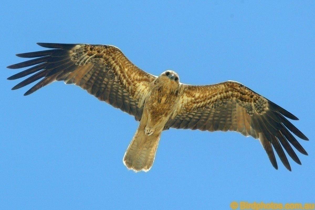 Size: 52-59cm Habitat: Distributed Australia wide, this raptor can be seen soaring over grasslands, woodlands, swamp, plains and seashores. Feeds on carrion, fish, small mammals and other birds. Notes: Head, chest and belly light brown with pale streaks, wings dark brown, long rounded tail in flight. Breeds Winter-Spring.