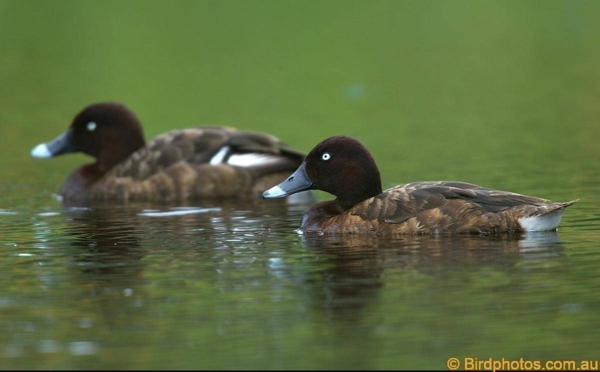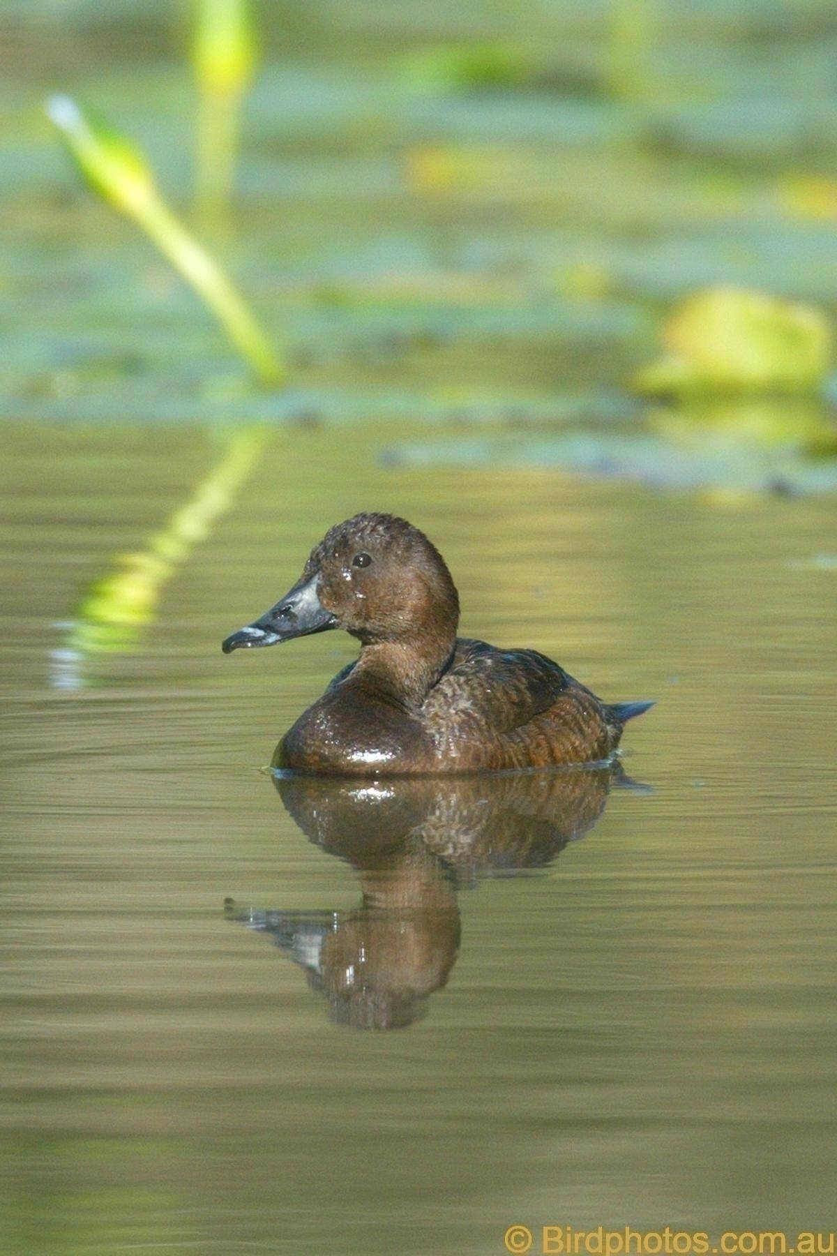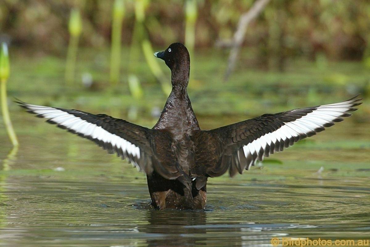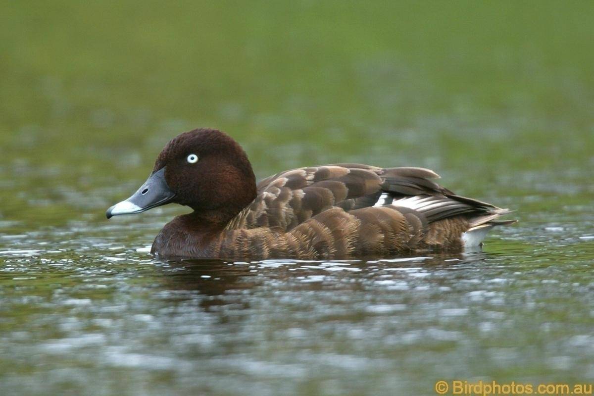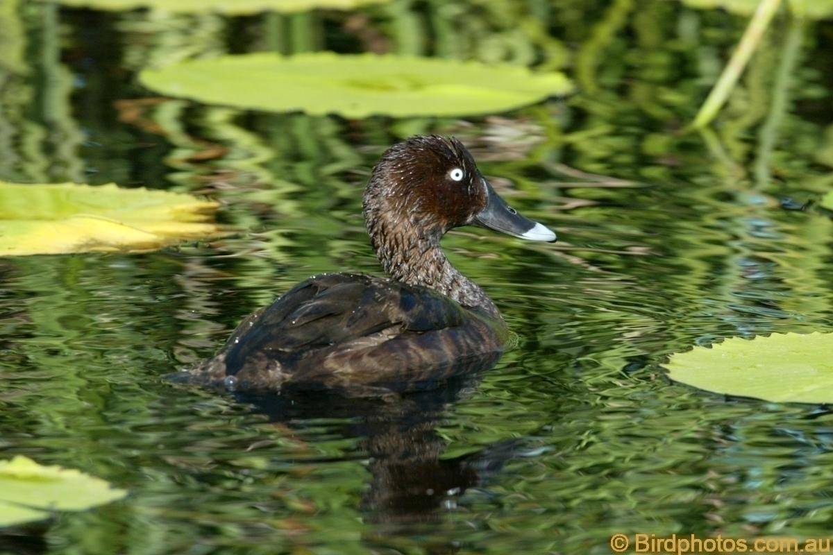 Size: 42-58cm Habitat: Distributed through out Australia, the White eyed Duck prefers the deep water of streams, ponds and swamps. Diving deep for vegetation and fish. Notes: Male: Brown bird with white eye and belly, Female has brown eye. Breeds Spring.