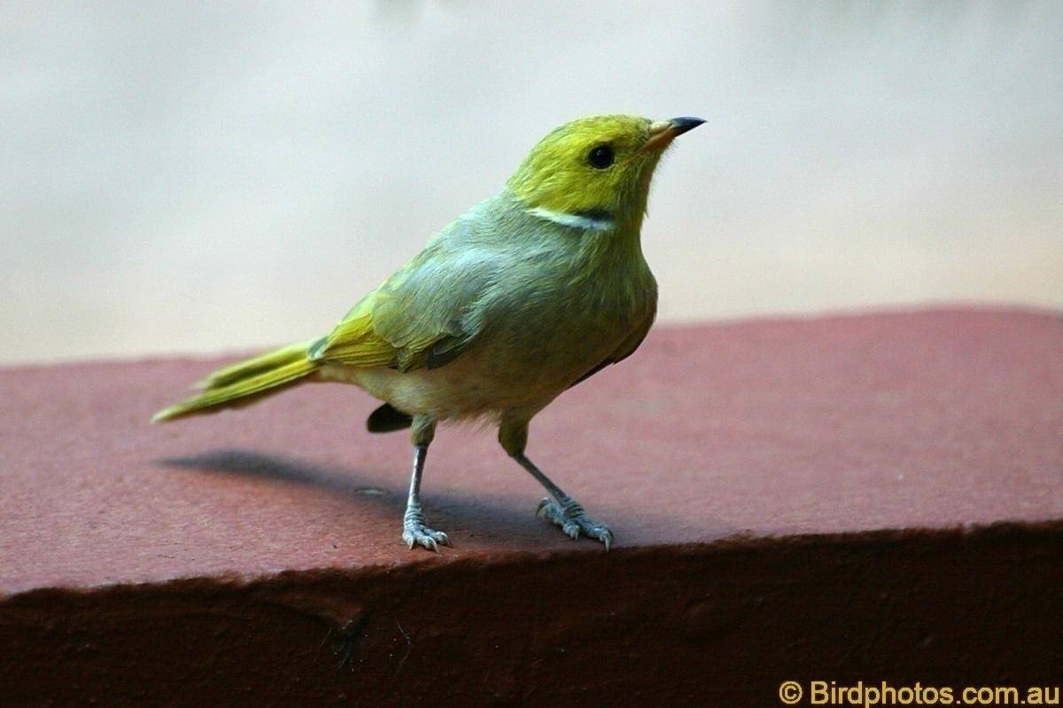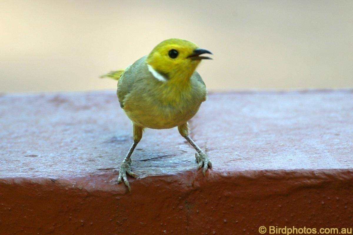 Size: 17cm Habitat: Distributed across Australia's inland regions, through out VIC and most of NSW, the White plumed Honeyeater inhabits open forests, usually near water. Diet consists of insects and nectar. Notes: Olive/lemon coloured bird with dark eye and yellow face. White stripe on side of neck with grey line across top. Breeds Winter-Spring-Summer.